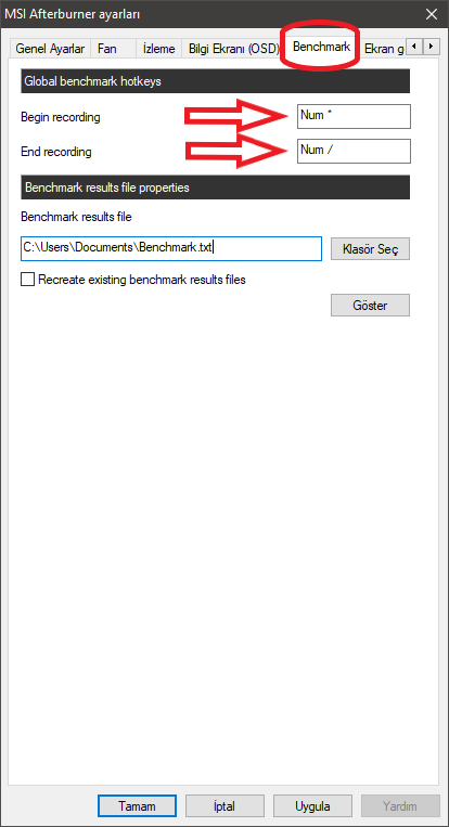 • En düşük kare (FPS), en yüksek kare ve ortalama kare değerlerini görmek için “Benchmark” kısmından “Begin Recording” (Kaydı Başlat) ve “End Recording” (Kaydı Sonlandır) kısımlarının yanındaki boşluklara birer tuş atıyoruz. (Biz çok kullanmadığımız “yıldız ve slash tuşlarını” kullandık.)